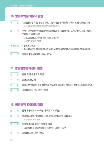 2025 %uad11%uc591%uc2dc %uc0dd%uc560%ubcf5%uc9c0%uc815%ucc45 %uc548%ub0b4%uc11c7410. %ubc29%uacfc%ud6c4%ud559%uad50 %uc790%uc720%uc218%uac15%uad8c%ub300 %uc0c1 %uae30%ucd08%uc0dd%ud65c%uc218%uae09%uc790 %ubc0f %ud55c%ubd80%ubaa8%uac00%uc871, %ucc28%uc0c1%uc704%uacc4%uce35 %ub4f1 %uc800%uc18c%ub4dd %uac00%uad6c%uc758 %ucd08%u00b7%uc911%u00b7%uace0%ud559%uc0dd %uc790%ub140 %u203b %uc2dc%ub3c4%uad50%uc721%uccad%uc758 %uae30%uc900%uc5d0 %ub530%ub77c %uc9c0%uc6d0%ub300%uc0c1 %ubc94%uc704 %uc0c1%uc774%ub0b4 %uc6a9 1%uc778%ub2f9 %uc5f0%uac04 60%ub9cc%uc6d0 %ub0b4%uc678%uc5d0%uc11c %ubc29%uacfc%ud6c4%ud559%uad50 %uc218%uac15%ub8cc(%uac15%uc0ac%ub8cc, %ub3c4%uc11c%uad6c%uc785%ube44, %uc7ac%ub8cc%uad6c%uc785%ube44, %uc218%uc6a9%ube44 %ub4f1 %ud3ec%ud568) %uc9c0%uc6d0%u00bb %uc2dc%ub3c4%uad50%uc721%uccad%uc758 %uae30%uc900%uc5d0 %ub530%ub77c %uc9c0%uc6d0%uae08%uc561 %uc0c1%uc774%u00bb %uc2e0%uccad%ud55c %ub2ec%ubd80%ud130 %uc9c0%uc6d0%u0009%uc2e0%uccad%ubc29%ubc95 %u2022 %uc74d%uba74%ub3d9%uc0ac%ubb34%uc18c%u2022 %ubcf5%uc9c0%ub85c(www.bokjiro.go.kr) %ub610%ub294 %uad50%uc721%ube44%uc6d0%ud074%ub9ad%uc2dc%uc2a4%ud15c(oneclick.neis.go.kr)%ubb38 %uc758 %uad50%uc721%ube44 %uc911%uc559%uc0c1%ub2f4%uc13c%ud130 1544-965411. %uad11%uc591%ubc1c%uba85%uad50%uc721%uc13c%ud130 %uc6b4%uc601%ub300%u0009 %uc0c1 %uad00%ub0b4 %ucd08%u00b7%uc911%u00b7%uace0%ub4f1%ud559%uad50 %ud559%uc0dd%uc704 %u0009 %uce58 %uad11%uc601%ucd08%ub4f1%ud559%uad50 %ub0b4%ub0b4 %u0009 %uc6a9 %ucc3d%uc758%uc735%ud569%uc778%uc7ac%uc721%uc131, %ubbf8%ub798 %ud575%uc2ec%uc778%uc7ac %uc9c4%ub85c%uac1c%ucc99, %ucd08%uc911%ud559%uc0dd %uc9c0%uc2dd%uc7ac%uc0b0 %ucc3d%ucd9c %ub4f1 %ud504%ub85c%uadf8%ub7a8 %uc6b4%uc601%ubb38 %u0009 %uc758 %uad11%uc591%ubc1c%uba85%uad50%uc721%uc13c%ud130 792-890912. %uc5ec%ub984%ubc29%ud559 %uc601%uc5b4%uccb4%ud5d8%ucea0%ud504%ub300%u0009 %uc0c1 %uad00%ub0b4 %ucd08%ub4f1%ud559%uad50 4 ~ 6%ud559%ub144, %uc911%ud559%uad50 1 ~ 3%ud559%ub144%ub0b4 %u0009 %uc6a9 %ud504%ub85c%uc81d%ud2b8 %uc218%uc5c5, %ubc1c%ud45c%ub300%ud68c, %uc9c1%uc5c5 %ubc0f %uc678%uad6d%ubb38%ud654 %uccb4%ud5d8 %uae30%ud68c %uc81c%uacf5 %u203b %uc804%ubb38%uc5c5%uccb4 %uc704%ud0c1 %uc6b4%uc601%ubc29 %u0009 %ubc95 %ud559%uad50%uc7a5 %ucd94%ucc9c%uc5d0 %ub530%ub77c 170%uc5ec %uba85 %uc120%ubc1c%u00bb %ucd08%ub4f1%ud559%uc0dd(4~6%ud559%ub144) 90%uba85, %uc911%ud559%uc0dd(1~3%ud559%ub144) 80%uba85%ubb38 %u0009 %uc758 %uad50%uc721%uccad%uc18c%ub144%uacfc 797-1960