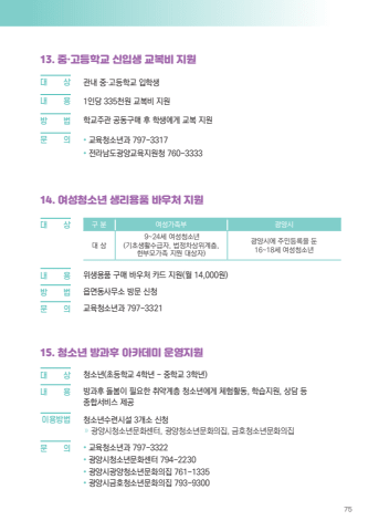 7513. %uc911%u00b7%uace0%ub4f1%ud559%uad50 %uc2e0%uc785%uc0dd %uad50%ubcf5%ube44 %uc9c0%uc6d0%ub300 %u0009 %uc0c1 %uad00%ub0b4 %uc911%u00b7%uace0%ub4f1%ud559%uad50 %uc785%ud559%uc0dd%ub0b4%u0009 %uc6a9 1%uc778%ub2f9 335%ucc9c%uc6d0 %uad50%ubcf5%ube44 %uc9c0%uc6d0%ubc29%u0009 %ubc95 %ud559%uad50%uc8fc%uad00 %uacf5%ub3d9%uad6c%ub9e4 %ud6c4 %ud559%uc0dd%uc5d0%uac8c %uad50%ubcf5 %uc9c0%uc6d0%ubb38%u0009 %uc758 %u2022 %uad50%uc721%uccad%uc18c%ub144%uacfc 797-3317%u2022 %uc804%ub77c%ub0a8%ub3c4%uad11%uc591%uad50%uc721%uc9c0%uc6d0%uccad 760-333314. %uc5ec%uc131%uccad%uc18c%ub144 %uc0dd%ub9ac%uc6a9%ud488 %ubc14%uc6b0%ucc98 %uc9c0%uc6d0%ub300%u0009 %uc0c1 %uad6c %ubd84 %uc5ec%uc131%uac00%uc871%ubd80 %uad11%uc591%uc2dc%ub300 %uc0c1 9~24%uc138 %uc5ec%uc131%uccad%uc18c%ub144(%uae30%ucd08%uc0dd%ud65c%uc218%uae09%uc790, %ubc95%uc815%ucc28%uc0c1%uc704%uacc4%uce35,%ud55c%ubd80%ubaa8%uac00%uc871 %uc9c0%uc6d0 %ub300%uc0c1%uc790)%uad11%uc591%uc2dc%uc5d0 %uc8fc%ubbfc%ub4f1%ub85d%uc744 %ub45416~18%uc138 %uc5ec%uc131%uccad%uc18c%ub144%ub0b4 %u0009 %uc6a9 %uc704%uc0dd%uc6a9%ud488 %uad6c%ub9e4 %ubc14%uc6b0%ucc98 %uce74%ub4dc %uc9c0%uc6d0(%uc6d4 14,000%uc6d0)%ubc29 %u0009 %ubc95 %uc74d%uba74%ub3d9%uc0ac%ubb34%uc18c %ubc29%ubb38 %uc2e0%uccad%ubb38 %u0009 %uc758 %uad50%uc721%uccad%uc18c%ub144%uacfc 797-332115. %uccad%uc18c%ub144 %ubc29%uacfc%ud6c4 %uc544%uce74%ub370%ubbf8 %uc6b4%uc601%uc9c0%uc6d0%ub300 %uc0c1 %uccad%uc18c%ub144(%ucd08%ub4f1%ud559%uad50 4%ud559%ub144 ~ %uc911%ud559%uad50 3%ud559%ub144)%ub0b4 %uc6a9 %ubc29%uacfc%ud6c4 %ub3cc%ubd04%uc774 %ud544%uc694%ud55c %ucde8%uc57d%uacc4%uce35 %uccad%uc18c%ub144%uc5d0%uac8c %uccb4%ud5d8%ud65c%ub3d9, %ud559%uc2b5%uc9c0%uc6d0, %uc0c1%ub2f4 %ub4f1 %uc885%ud569%uc11c%ube44%uc2a4 %uc81c%uacf5%u0009%uc774%uc6a9%ubc29%ubc95 %uccad%uc18c%ub144%uc218%ub828%uc2dc%uc124 3%uac1c%uc18c %uc2e0%uccad%u00bb %uad11%uc591%uc2dc%uccad%uc18c%ub144%ubb38%ud654%uc13c%ud130, %uad11%uc591%uccad%uc18c%ub144%ubb38%ud654%uc758%uc9d1, %uae08%ud638%uccad%uc18c%ub144%ubb38%ud654%uc758%uc9d1%ubb38%u0009 %uc758 %u2022 %uad50%uc721%uccad%uc18c%ub144%uacfc 797-3322%u2022 %uad11%uc591%uc2dc%uccad%uc18c%ub144%ubb38%ud654%uc13c%ud130 794-2230%u2022 %uad11%uc591%uc2dc%uad11%uc591%uccad%uc18c%ub144%ubb38%ud654%uc758%uc9d1 761-1335%u2022 %uad11%uc591%uc2dc%uae08%ud638%uccad%uc18c%ub144%ubb38%ud654%uc758%uc9d1 793-9300