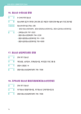 2025 %uad11%uc591%uc2dc %uc0dd%uc560%ubcf5%uc9c0%uc815%ucc45 %uc548%ub0b4%uc11c7616. %uccad%uc18c%ub144 %uc218%ub828%uc2dc%uc124 %uc6b4%uc601%ub300 %uc0c1 9~24%uc138 %uc774%ud558 %uccad%uc18c%ub144%ub0b4 %u0009 %uc6a9 %uccad%uc18c%ub144%uc5d0%uac8c %uc811%uadfc%uc774 %ud3b8%ub9ac%ud55c %uad50%uc721%u00b7%ubb38%ud654 %uacf5%uac04 %uc81c%uacf5%uacfc %ub2e4%uc591%ud55c %ubb38%ud654%u00b7%uc608%uc220%u00b7%ub180%uc774 %ud504%ub85c%uadf8%ub7a8 %uc81c%uacf5%u0009%uc774%uc6a9%ubc29%ubc95 %uccad%uc18c%ub144%uc218%ub828%uc2dc%uc124 3%uac1c%uc18c %uc2e0%uccad%u00bb %uad11%uc591%uc2dc%uccad%uc18c%ub144%ubb38%ud654%uc13c%ud130, %uad11%uc591%uc2dc%uad11%uc591%uccad%uc18c%ub144%ubb38%ud654%uc758%uc9d1, %uad11%uc591%uc2dc%uae08%ud638%uccad%uc18c%ub144%ubb38%ud654%uc758%uc9d1%ubb38 %uc758 %u2022 %uad50%uc721%uccad%uc18c%ub144%uacfc 797-3322%u2022 %uad11%uc591%uc2dc%uccad%uc18c%ub144%ubb38%ud654%uc13c%ud130 794-2230%u2022 %uad11%uc591%uc2dc%uad11%uc591%uccad%uc18c%ub144%ubb38%ud654%uc758%uc9d1 761-1335%u2022 %uad11%uc591%uc2dc%uae08%ud638%uccad%uc18c%ub144%ubb38%ud654%uc758%uc9d1 793-930017. %uccad%uc18c%ub144 %uc0c1%ub2f4%ubcf5%uc9c0%uc13c%ud130 %uc6b4%uc601%ub300%u0009 %uc0c1 %uad00%ub0b4 %uc704%uae30 %uccad%uc18c%ub144%ub0b4 %u0009 %uc6a9 %uac1c%uc778%uc0c1%ub2f4, %uc2ec%ub9ac%uac80%uc0ac, %ub610%ub798%uc0c1%ub2f4%uc0ac%uc5c5, %ubd80%ubaa8%uc9d1%ub2e8 %ud504%ub85c%uadf8%ub7a8 %ub4f1%uc704 %u0009 %uce58 %uad11%uc591%uc2dc %uad11%uc7a5%ub85c 14%ubb38 %u0009 %uc758 %uad11%uc591%uc2dc%uccad%uc18c%ub144%uc0c1%ub2f4%ubcf5%uc9c0%uc13c%ud130 795-700818. %uc9c0%uc5ed%uc0ac%ud68c %uccad%uc18c%ub144 %ud1b5%ud569%uc9c0%uc6d0%uccb4%uacc4(%uccad%uc18c%ub144%uc548%uc804%ub9dd)%ub300%u0009 %uc0c1 %uad00%ub0b4 %uc704%uae30 %uccad%uc18c%ub144%ub0b4 %u0009 %uc6a9 %uc704%uae30%uccad%uc18c%ub144 %ud1b5%ud569%uc9c0%uc6d0%uc0ac%uc5c5, %uc704%uae30%uccad%uc18c%ub144 %uad50%uc721%uc9c0%uc6d0%uc0ac%uc5c5 %ub4f1%ubb38 %u0009 %uc758 %uad11%uc591%uc2dc%uccad%uc18c%ub144%uc0c1%ub2f4%ubcf5%uc9c0%uc13c%ud130 795-7008