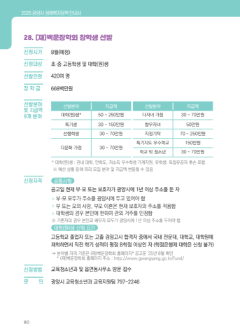 2025 %uad11%uc591%uc2dc %uc0dd%uc560%ubcf5%uc9c0%uc815%ucc45 %uc548%ub0b4%uc11c8028. (%uc7ac)%ubc31%uc6b4%uc7a5%ud559%ud68c %uc7a5%ud559%uc0dd %uc120%ubc1c%uc2e0%uccad%uc2dc%uae30%u0009 8%uc6d4(%uc608%uc815)%uc2e0%uccad%ub300%uc0c1%u0009 %ucd08%u00b7%uc911%u00b7%uace0%ub4f1%ud559%uc0dd %ubc0f %ub300%ud559(%uc6d0)%uc0dd%uc120%ubc1c%uc778%uc6d0%u0009 420%uc5ec %uba85%uc7a5 %ud559 %uae08%u0009 668%ubc31%ub9cc%uc6d0 %uc120%ubc1c%ubd84%uc57c %uc9c0%uae09%uc561 %uc120%ubc1c%ubd84%uc57c %uc9c0%uae09%uc561%ub300%ud559(%uc6d0)%uc0dd* 50 ~ 250%ub9cc%uc6d0 %ub2e4%uc790%ub140 %uac00%uc815 30 ~ 70%ub9cc%uc6d0%ud2b9%uae30%uc0dd 30 ~ 150%ub9cc%uc6d0 %ud5a5%uc6b0%uc790%ub140 50%ub9cc%uc6d0%uc120%ud589%ud559%uc0dd 30 ~ 70%ub9cc%uc6d0 %uc9c0%uc815%uae30%ud0c1 70 ~ 250%ub9cc%uc6d0%ub2e4%ubb38%ud654 %uac00%uc815 30 ~ 70%ub9cc%uc6d0%ud2b9%uae30%uc9c0%ub3c4 %uc6b0%uc218%ud559%uad50 150%ub9cc%uc6d0%ud559%uad50 %ubc16 %uccad%uc18c%ub144 30 ~ 70%ub9cc%uc6d0* %ub300%ud559(%uc6d0)%uc0dd : %uad00%ub0b4 %ub300%ud559, %ub9cc%ud559%ub3c4, %uc800%uc18c%ub4dd %uc6b0%uc218%ud559%uc0dd %uac00%uacc4%uc9c0%uc6d0, %uc720%ud559%uc0dd, %ub3c5%ub9bd%uc720%uacf5%uc790 %ud6c4%uc190 %ud3ec%ud568 %u203b %uc608%uc0b0 %uc0c1%ud669 %ub4f1%uc5d0 %ub530%ub77c %ubaa8%uc9d1 %ubd84%uc57c %ubc0f %uc9c0%uae09%uc561 %ubcc0%ub3d9%ub420 %uc218 %uc788%uc74c%uc2e0%uccad%uc790%uaca9%u0009 %uacf5%ud1b5%uc0ac%ud56d %uacf5%uace0%uc77c %ud604%uc7ac %ubd80%u00b7%ubaa8 %ub610%ub294 %ubcf4%ud638%uc790%uac00 %uad11%uc591%uc2dc%uc5d0 1%ub144 %uc774%uc0c1 %uc8fc%uc18c%ub97c %ub454 %uc790%u00bb %ubd80%u00b7%ubaa8 %ubaa8%ub450%uac00 %uc8fc%uc18c%ub97c %uad11%uc591%uc2dc%uc5d0 %ub450%uace0 %uc788%uc5b4%uc57c %ud568%u00bb %ubd80 %ub610%ub294 %ubaa8%uc758 %uc0ac%ub9dd, %ubd80%ubaa8 %uc774%ud63c%uc740 %ud604%uc7ac %ubcf4%ud638%uc790%uc758 %uc8fc%uc18c%ub97c %uc801%uc6a9%ud568%u00bb %ub300%ud559%uc0dd%uc758 %uacbd%uc6b0 %ubcf8%uc778%uc5d0 %ud55c%ud558%uc5ec %uad00%uc678 %uac70%uc8fc%ub97c %uc778%uc815%ud568%u203b %uae30%ud63c%uc790%uc758 %uacbd%uc6b0 %ubcf8%uc778%uacfc %ubc30%uc6b0%uc790 %ubaa8%ub450%uac00 %uad11%uc591%uc2dc%uc5d0 1%ub144 %uc774%uc0c1 %uc8fc%uc18c%ub97c %ub450%uc5b4%uc57c %ud568 %ub300%ud559(%uc6d0)%uc0dd %uc2e0%uccad %uc694%uac74 %uace0%ub4f1%ud559%uad50 %uc878%uc5c5%uc790 %ub610%ub294 %uace0%uc878 %uac80%uc815%uace0%uc2dc %ud569%uaca9%uc790 %uc911%uc5d0%uc11c %uad6d%ub0b4 %uc804%ubb38%ub300, %ub300%ud559%uad50, %ub300%ud559%uc6d0%uc5d0 %uc7ac%ud559%ud558%uba74%uc11c %uc9c1%uc804 %ud559%uae30 %uc131%uc801%uc774 %ud3c9%uc810 B%ud559%uc810 %uc774%uc0c1%uc778 %uc790 (%ud559%uc810%uc740%ud589%uc81c %ub300%ud559%uc740 %uc2e0%uccad %ubd88%uac00)%u21d2 %ubd84%uc57c%ubcc4 %uc790%uaca9 %uae30%uc900%uc740 (%uc7ac)%ubc31%uc6b4%uc7a5%ud559%ud68c %ud648%ud398%uc774%uc9c0* %uacf5%uace0%ubb38 '25%ub144 8%uc6d4 %ud655%uc778* (%uc7ac)%ubc31%uc6b4%uc7a5%ud559%ud68c %ud648%ud398%uc774%uc9c0 %uc8fc%uc18c : http://www.gwangyang.go.kr/fund/%uc2e0%uccad%ubc29%ubc95%u0009 %uad50%uc721%uccad%uc18c%ub144%uacfc %ubc0f %uc74d%uba74%ub3d9%uc0ac%ubb34%uc18c %ubc29%ubb38 %uc811%uc218%ubb38%u0009 %uc758 %uad11%uc591%uc2dc %uad50%uc721%uccad%uc18c%ub144%uacfc %uad50%uc721%uc9c0%uc6d0%ud300 797-2246%uc120%ubc1c%ubd84%uc57c%ubc0f %uc9c0%uae09%uc5619%uac1c %ubd84%uc57c