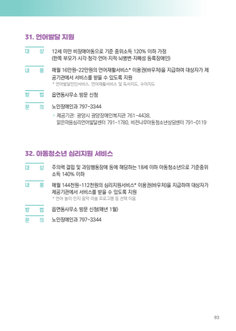 8331. %uc5b8%uc5b4%ubc1c%ub2ec %uc9c0%uc6d0%ub300%u0009 %uc0c1 12%uc138 %ubbf8%ub9cc %ube44%uc7a5%uc560%uc544%ub3d9%uc73c%ub85c %uae30%uc900 %uc911%uc704%uc18c%ub4dd 120% %uc774%ud558 %uac00%uc815(%ud55c%ucabd %ubd80%ubaa8%uac00 %uc2dc%uac01%u00b7%uccad%uac01%u00b7%uc5b8%uc5b4%u00b7%uc9c0%uc801%u00b7%ub1cc%ubcd1%ubcc0%u00b7%uc790%ud3d0%uc131 %ub4f1%ub85d%uc7a5%uc560%uc778) %ub0b4%u0009 %uc6a9 %ub9e4%uc6d4 16%ub9cc%uc6d0~22%ub9cc%uc6d0%uc758 %uc5b8%uc5b4%uc7ac%ud65c%uc11c%ube44%uc2a4* %uc774%uc6a9%uad8c(%ubc14%uc6b0%ucc98)%uc744 %uc9c0%uae09%ud558%uc5ec %ub300%uc0c1%uc790%uac00 %uc81c%uacf5%uae30%uad00%uc5d0%uc11c %uc11c%ube44%uc2a4%ub97c %ubc1b%uc744 %uc218 %uc788%ub3c4%ub85d %uc9c0%uc6d0 * %uc5b8%uc5b4%ubc1c%ub2ec%uc9c4%ub2e8%uc11c%ube44%uc2a4, %uc5b8%uc5b4%uc7ac%ud65c%uc11c%ube44%uc2a4 %ubc0f %ub3c5%uc11c%uc9c0%ub3c4, %uc218%uc5b4%uc9c0%ub3c4%ubc29%u0009 %ubc95 %uc74d%uba74%ub3d9%uc0ac%ubb34%uc18c %ubc29%ubb38 %uc2e0%uccad%ubb38%u0009 %uc758 %ub178%uc778%uc7a5%uc560%uc778%uacfc 797-3344%u00bb %uc81c%uacf5%uae30%uad00: %uad11%uc591%uc2dc %uad11%uc591%uc7a5%uc560%uc778%ubcf5%uc9c0%uad00 761-4438, %ub9d1%uc740%ub9c8%uc74c%uc2ec%ub9ac%uc5b8%uc5b4%ubc1c%ub2ec%uc13c%ud130 791-1780, %ube44%uc804%ub098%ubb34%uc544%ub3d9%uccad%uc18c%ub144%uc0c1%ub2f4%uc13c%ud130 791-011932. %uc544%ub3d9%uccad%uc18c%ub144 %uc2ec%ub9ac%uc9c0%uc6d0 %uc11c%ube44%uc2a4%ub300%u0009 %uc0c1 %uc8fc%uc758%ub825 %uacb0%ud54d %ubc0f %uacfc%uc789%ud589%ub3d9%uc7a5%uc560 %ub4f1%uc5d0 %ud574%ub2f9%ud558%ub294 18%uc138 %uc774%ud558 %uc544%ub3d9%uccad%uc18c%ub144%uc73c%ub85c %uae30%uc900%uc911%uc704%uc18c%ub4dd 140% %uc774%ud558%ub0b4 %u0009 %uc6a9 %ub9e4%uc6d4 144%ucc9c%uc6d0~112%ucc9c%uc6d0%uc758 %uc2ec%ub9ac%uc9c0%uc6d0%uc11c%ube44%uc2a4* %uc774%uc6a9%uad8c(%ubc14%uc6b0%ucc98)%uc744 %uc9c0%uae09%ud558%uc5ec %ub300%uc0c1%uc790%uac00 %uc81c%uacf5%uae30%uad00%uc5d0%uc11c %uc11c%ube44%uc2a4%ub97c %ubc1b%uc744 %uc218 %uc788%ub3c4%ub85d %uc9c0%uc6d0* %uc5b8%uc5b4%u00b7%ub180%uc774%u00b7%uc778%uc9c0%u00b7%uc74c%uc545%u00b7%ubbf8%uc220 %ud504%ub85c%uadf8%ub7a8 %ub4f1 %uc120%ud0dd %uc774%uc6a9%ubc29%u0009 %ubc95 %uc74d%uba74%ub3d9%uc0ac%ubb34%uc18c %ubc29%ubb38 %uc2e0%uccad(%ub9e4%ub144 1%uc6d4)%ubb38 %u0009 %uc758 %ub178%uc778%uc7a5%uc560%uc778%uacfc 797-3344