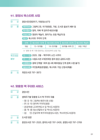 8941. %uad11%uc591%uc2dc %ubd81%uc2a4%ud0c0%ud2b8 %uc0ac%uc5c5%ub300%u0009 %uc0c1 %uad11%uc591%uc2dc%ubbfc(%uc601%uc720%uc544%uae30, %uc544%ub3d9%uccad%uc18c%ub144%uae30)%ub0b4%u0009 %uc6a9 %ucc45%uafb8%ub7ec%ubbf8 %uadf8%ub9bc%ucc45 2%uad8c, %uc544%uae30%ud68c%uc6d0%uc99d, %uac00%ubc29, %ub3c4%uc11c%uad00 %ud64d%ubcf4%uc9c0 %ubc30%ubd80 %ub4f1 %ub3c5%uc11c%ud589%uc0ac %uc5c4%ub9c8, %uc544%ube60 %ucc45 %uc77d%uc5b4%uc8fc%uc138%uc694!(4%uc6d4) %ud504%ub85c%uadf8%ub7a8 %uc601%uc720%uc544 %ucc45%ub180%uc774, %ucc3e%uc544%uac00%ub294 %ucd08%ub4f1 %ucc45%ub0a0%uac1c %ub4f1 %ucc38%uace0 %ubd81%uc2a4%ud0c0%ud2b8 %uafb8%ub7ec%ubbf8 %ub2e8%uacc4%ub2e8%uacc4 %ubd81%uc2a4%ud0c0%ud2b8 1%ub2e8%uacc4 %ubd81%uc2a4%ud0c0%ud2b8 2%ub2e8%uacc4 %ubd81%uc2a4%ud0c0%ud2b8 3%ub2e8%uacc4 %ubd81%uc2a4%ud0c0%ud2b8 %ucc45%ub0a0%uac1c%ub300%uc0c1 13~18%uac1c%uc6d4 19~35%uac1c%uc6d4 36%uac1c%uc6d4~%ucde8%ud559 %uc804 %ucd08%ub4f1 1%ud559%ub144 %u203b %u2018%uc0dd%uc560 %uccab %ucc45%u2019 %uc9c0%uc6d0 %uc601%uc720%uc544%ub294 2026%ub144%ubd80%ud130 %uc2e0%uccad %uac00%ub2a5 %uae30 %uac04 2025. 3%uc6d4 ~ %ucc45%uafb8%ub7ec%ubbf8 %uc18c%uc9c4 %uc2dc%uae4c%uc9c0 %uae30 %uad00 %uc2dc%ub9bd%ub3c4%uc11c%uad00 4%uac1c%uad00(%ud76c%ub9dd%u00b7%uc911%ub9c8%u00b7%uc6a9%uac15%u00b7%uae08%ud638%ub3c4%uc11c%uad00) %uc218%ub839%ud69f%uc218 %uc0dd%uc560 %ub2e8%uacc4%ubcc4 1%ud68c%uc529 %ucd1d 4%ud68c %ubc30%ubd80(%ub3d9%uc77c %ub2e8%uacc4 %uc911%ubcf5 %uc218%ub839 %ubd88%uac00) %ud544%uc694%uc11c%ub958 %uc8fc%ubbfc%ub4f1%ub85d%ub4f1%ubcf8(%uc5f4%ub78c), %ubd81%uc2a4%ud0c0%ud2b8 %uac00%uc785 %uc2e0%uccad%uc11c(%uc81c%ucd9c)%ubb38%u0009 %uc758 %ud76c%ub9dd%ub3c4%uc11c%uad00 797-387342. %ub9de%ucda4%ud615 %ucc45 %uafb8%ub7ec%ubbf8 %uc11c%ube44%uc2a4%ub300 %u0009 %uc0c1 %uad11%uc591%uc2dc%ubbfc%ub0b4%u0009 %uc6a9 %uc0dd%uc560%uc8fc%uae30%ubcc4 %ub9de%ucda4%ud615 %ub3c4%uc11c %ucc45 %uafb8%ub7ec%ubbf8 %ub300%ucd9c %u00bb (%uc601 %uc720 %uc544) %uadf8%ub9bc%ucc45%uc218%ub808(%uc5f0 6%ud68c %uc2e0%uccad)%u00bb (%uc5b4 %ub9b0 %uc774) %uc601%uc5b4%ucc45 %uafb8%ub7ec%ubbf8(%uad11%uc601)%u00bb (%ucd08%ub4f1%ud559%uc0dd) %uad50%uacfc%uc5f0%uacc4%ub3c4%uc11c %ubc0f %uc5ed%uc0ac%ub3c4%uc11c(%uc911%ub9c8)%u00bb (%uc911 %ud559 %uc0dd) %uccad%uc18c%ub144%ud544%ub3c5%uc11c %ubc0f %uc5ed%uc0ac%ub3c4%uc11c(%uc911%ub9c8)%u00bb (%uc131 %uc778) %ud070%uae00%uc790%ucc45 %ubd81%uafb8%ub7ec%ubbf8(%uc911%uc559%ub3c4%uc11c%uad00), %uc5ed%uc0ac%ucd94%ucc9c%ub3c4%uc11c(%uc911%ub9c8)%uc2e0 %u0009 %uccad %ub3c4%uc11c%uad00 %ubc29%ubb38%ubb38%u0009 %uc758 %uc911%uc559%ub3c4%uc11c%uad00 797-2520, %uc911%ub9c8%ub3c4%uc11c%uad00 797-2430, %uad11%uc601%ub3c4%uc11c%uad00 797-3769%ucc45%uafb8%ub7ec%ubbf8%ubc30%ubd80