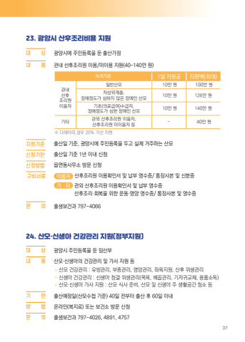 3723. %uad11%uc591%uc2dc %uc0b0%ud6c4%uc870%ub9ac%ube44%uc6a9 %uc9c0%uc6d0%ub300%u0009 %uc0c1 %uad11%uc591%uc2dc%uc5d0 %uc8fc%ubbfc%ub4f1%ub85d%uc744 %ub454 %ucd9c%uc0b0%uac00%uc815%ub0b4%u0009 %uc6a9 %uad00%ub0b4 %uc0b0%ud6c4%uc870%ub9ac%uc6d0 %uc774%uc6a9/%ubbf8%uc774%uc6a9 %uc9c0%uc6d0(40~140%ub9cc %uc6d0)%uc790%uaca9%uae30%uc900 1%uc77c %uc9c0%uc6d0%uae08 %uc9c0%uc6d0%uc561(%ucd5c%ub300)%uad00%ub0b4%uc0b0%ud6c4%uc870%ub9ac%uc6d0 %uc774%uc6a9%uc790%uc77c%ubc18%uc0b0%ubaa8 10%ub9cc %uc6d0 100%ub9cc %uc6d0%ucc28%uc0c1%uc704%uacc4%uce35, %uc7a5%uc560%uc815%ub3c4%uac00 %uc2ec%ud558%uc9c0 %uc54a%uc740 %uc7a5%uc560%uc778 %uc0b0%ubaa8 10%ub9cc %uc6d0 126%ub9cc %uc6d0%uae30%ucd08(%uc758%ub8cc%uae09%uc5ec)%uc218%uae09%uc790, %uc7a5%uc560%uc815%ub3c4%uac00 %uc2ec%ud55c %uc7a5%uc560%uc778 %uc0b0%ubaa8 10%ub9cc %uc6d0 140%ub9cc %uc6d0%uae30%ud0c0 %uad00%uc678 %uc0b0%ud6c4%uc870%ub9ac%uc6d0 %uc774%uc6a9%uc790,%uc0b0%ud6c4%uc870%ub9ac%uc6d0 %ubbf8%uc774%uc6a9%uc790 %ub4f1- 40%ub9cc %uc6d0%u203b %ub2e4%ud0dc%uc544%uc758 %uacbd%uc6b0 20% %uac00%uc0b0 %uc9c0%uc6d0%uc9c0%uc6d0%uae30%uc900%u0009 %ucd9c%uc0b0%uc77c %uae30%uc900, %uad11%uc591%uc2dc%uc5d0 %uc8fc%ubbfc%ub4f1%ub85d%uc744 %ub450%uace0 %uc2e4%uc81c %uac70%uc8fc%ud558%ub294 %uc0b0%ubaa8%uc2e0%uccad%uae30%ud55c%u0009 %ucd9c%uc0b0%uc77c %uae30%uc900 1%ub144 %uc774%ub0b4 %uc2e0%uccad%uc2e0%uccad%ubc29%ubc95%u0009 %uc74d%uba74%ub3d9%uc0ac%ubb34%uc18c %ubc29%ubb38 %uc2e0%uccad%u0009%uad6c%ube44%uc11c%ub958 %uc774%uc6a9%uc790 %uc0b0%ud6c4%uc870%ub9ac%uc6d0 %uc774%uc6a9%ud655%uc778%uc11c %ubc0f %ub0a9%ubd80 %uc601%uc218%uc99d/ %ud1b5%uc7a5%uc0ac%ubcf8 %ubc0f %uc2e0%ubd84%uc99d %uae30 %ud0c0 %uad00%uc678 %uc0b0%ud6c4%uc870%ub9ac%uc6d0 %uc774%uc6a9%ud655%uc778%uc11c %ubc0f %ub0a9%ubd80 %uc601%uc218%uc99d%uc0b0%ud6c4%uc870%ub9ac%u00b7%ud68c%ubcf5%uc744 %uc704%ud55c %uc6b4%ub3d9%u00b7%uc601%uc591 %uc601%uc218%uc99d/ %ud1b5%uc7a5%uc0ac%ubcf8 %ubc0f %uc601%uc218%uc99d%ubb38%u0009 %uc758 %ucd9c%uc0dd%ubcf4%uac74%uacfc 797-406624. %uc0b0%ubaa8%u00b7%uc2e0%uc0dd%uc544 %uac74%uac15%uad00%ub9ac %uc9c0%uc6d0(%uc815%ubd80%uc9c0%uc6d0)%ub300%u0009 %uc0c1 %uad11%uc591%uc2dc %uc8fc%ubbfc%ub4f1%ub85d%uc744 %ub454 %uc784%uc0b0%ubd80%ub0b4%u0009 %uc6a9 %uc0b0%ubaa8%u00b7%uc2e0%uc0dd%uc544%uc758 %uac74%uac15%uad00%ub9ac %ubc0f %uac00%uc0ac %uc9c0%uc6d0 %ub4f1%u00bb %uc0b0%ubaa8 %uac74%uac15%uad00%ub9ac : %uc720%ubc29%uad00%ub9ac, %ubd80%uc885%uad00%ub9ac, %uc601%uc591%uad00%ub9ac, %uc88c%uc695%uc9c0%uc6d0, %uc0b0%ud6c4 %uc704%uc0dd%uad00%ub9ac%u00bb %uc2e0%uc0dd%uc544 %uac74%uac15%uad00%ub9ac : %uc2e0%uc0dd%uc544 %uccad%uacb0%u00b7%uc704%uc0dd%uad00%ub9ac(%ubaa9%uc695, %ubc30%uaf3d%uad00%ub9ac, %uae30%uc800%uadc0%uad50%uccb4, %uc6a9%ud488%uc18c%ub3c5)%u00bb %uc0b0%ubaa8%u00b7%uc2e0%uc0dd%uc544 %uac00%uc0ac %uc9c0%uc6d0 : %uc0b0%ubaa8 %uc2dd%uc0ac %uc900%ube44, %uc0b0%ubaa8 %ubc0f %uc2e0%uc0dd%uc544 %uc8fc %uc0dd%ud65c%uacf5%uac04 %uccad%uc18c %ub4f1%uae30%u0009 %ud55c %ucd9c%uc0b0%uc608%uc815%uc77c(%uc0b0%ubaa8%uc218%ucca9 %uae30%uc900) 40%uc77c %uc804%ubd80%ud130 %ucd9c%uc0b0 %ud6c4 60%uc77c %uc774%ub0b4 %ubc29 %u0009 %ubc95 %uc628%ub77c%uc778(%ubcf5%uc9c0%ub85c) %ub610%ub294 %ubcf4%uac74%uc18c %ubc29%ubb38 %uc2e0%uccad%ubb38%u0009 %uc758 %ucd9c%uc0dd%ubcf4%uac74%uacfc 797-4026, 4891, 4757